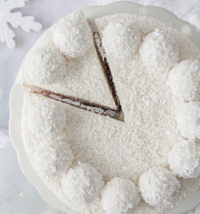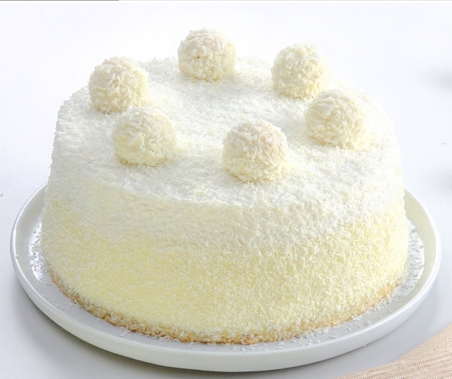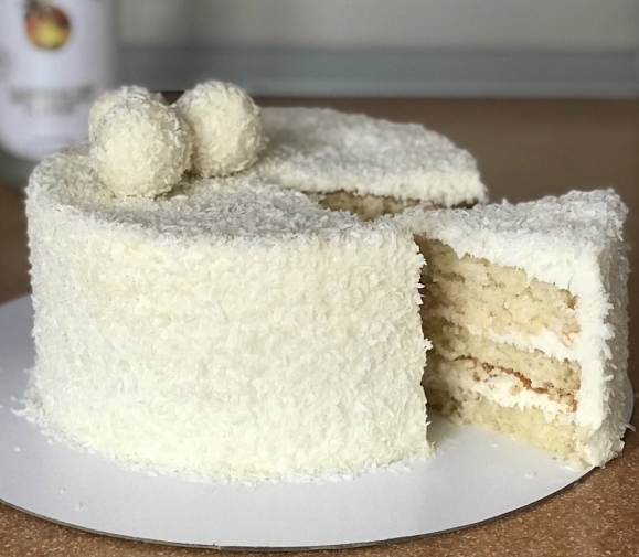 Торт "Рафаелло" - це справжній рай для любителів кокосу та мигдалю. Легкий бісквіт, просочений сиропом, ідеально поєднується з ніжним кремом на основі кокосового масла та вершків та хрусткою прослойкою з мигдалевими горішками. Поверхня торту вкрита кокосовою стружкою.